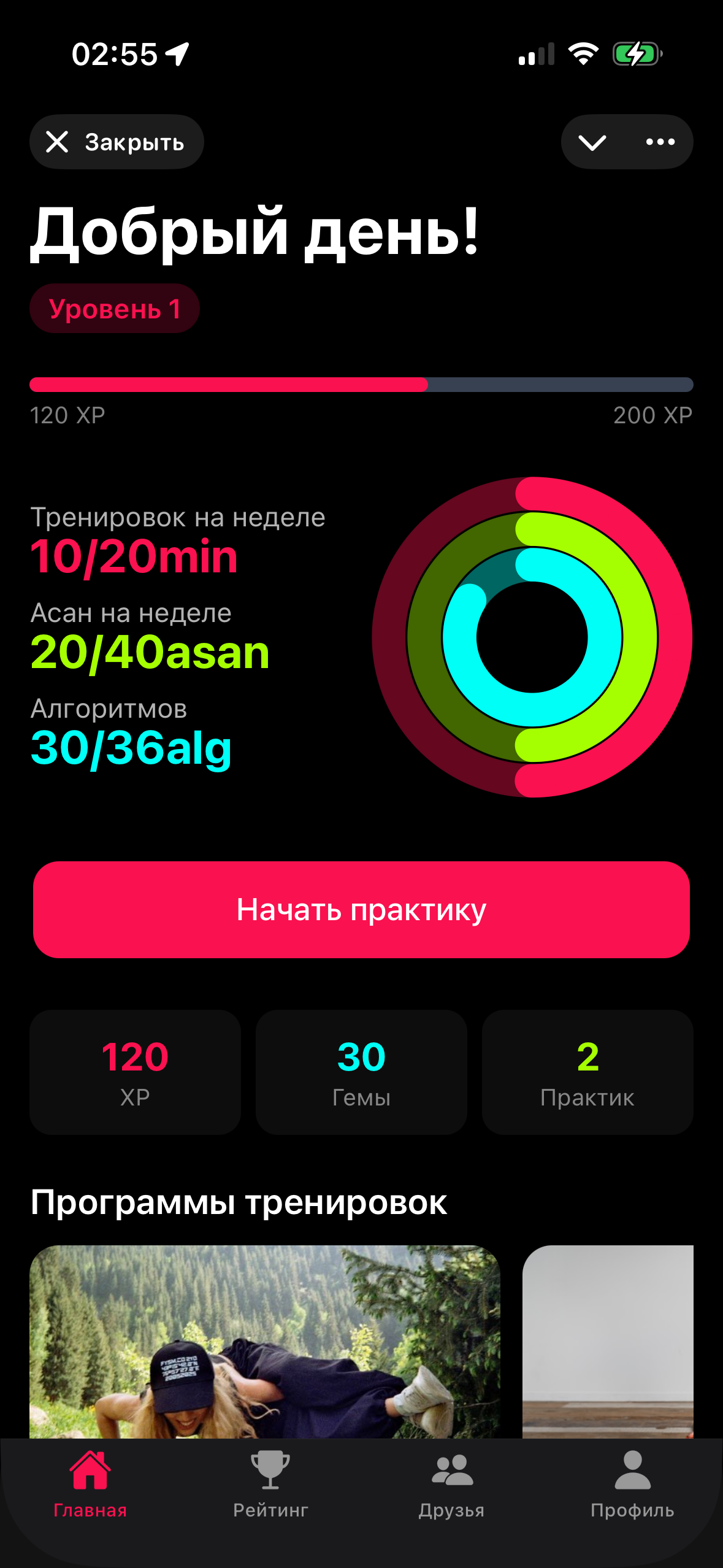 Ежедневная практика с геймификацией. XP, стрики, уровни — как в Duolingo, но для йоги